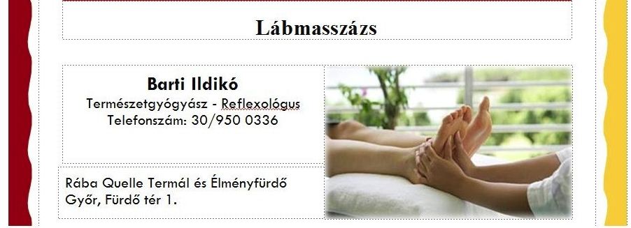 A nagy érdeklődésre tekintettel Barti Ildikó, természetgyógyász és talpmasszőr ismét meghirdeti talpmasszázs szolgáltatását egy kis akcióval megfűszerezve! Aki másodmagával érkezik , a második személy ingyen veheti igénybe a szolgáltatást! Egyet fizet kettőt kap!